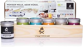Strandküche 6er Gewürze Geschenkset Bulli 375 g I Bio Gewürze Set mit Pfeffer Meersalz Kräuter BBQ Masala Süß Gewürzmischungen I Gewürz-Set in handgefertigter Holzbox mit Geschenkbanderole