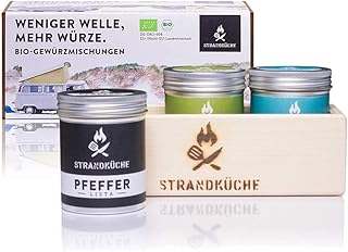 Strandküche 3er Gewürze Geschenkset Bulli 125 g I Bio Gewürze Set Basic mit Pfeffer Meersalz und Kräuter-Gewürzmischung I Exklusive Gewürze in handgefertigter Holzbox mit Geschenkbanderole