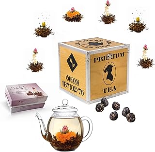 Creano Teeblumen - Mix Geschenkset Erblühtee mit 500ml Glaskanne in edler Holz-Dekobox - 6 verschiedene Teerosen in 3 Sorten (Schwarzer Tee)