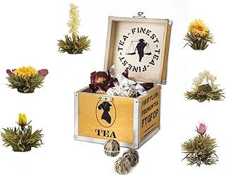 Creano ErblühTee Holz-Dekobox, Teeblumen Mix Geschenkset mit 6 Teerosen, Weißer Tee in edler Teekiste