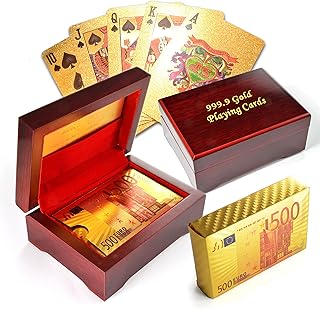Ganzoo Poker Geschenkset Texas Hold’em im 500EURO Noten Stil (Kartenrückseite), PVC-Karten im Gold-Design mit edler Holzschatulle (Holz, Hochglanz) - Marke